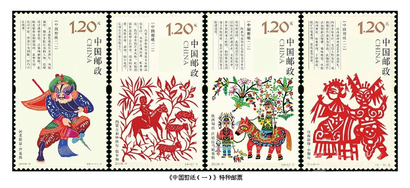 2018年1月24日,中國郵政發(fā)行《中國剪紙(第一組)》特種郵票,全套4枚。這是中國郵政繼1959年1月1日發(fā)行的《剪紙》特種郵票59年后重新發(fā)行的《中國剪紙》系列郵票。全系列郵票計劃發(fā)行4組,每組4枚。這次發(fā)行的第一組4枚郵票入選內容分別是被列入第一批國家級非物質(zhì)文化遺產(chǎn)名錄的北方四處剪紙傳承人的作品:第一枚“河北蔚縣·蘆花蕩”,河北蔚縣剪紙歷史悠久,風(fēng)格獨特,題材多取自于人物,造型設計疏密有致,點(diǎn)染絢麗鮮艷。此幅作品作者王老賞(1890-1951),河北省蔚縣南張莊村人;第二枚“內蒙和林格爾·牧羊圖”,內蒙古和林格爾剪紙多反映游牧生活,具有古拙浪漫、質(zhì)樸奔放、熱情率真的藝術(shù)風(fēng)格。此幅作品作者張花女 (1903-2004),和林格爾縣董家營(yíng)鄉曹老八夭村人;第三枚“陜西旬邑·江娃拉馬梅香騎”,陜西旬邑的彩色剪紙具有民間美術(shù)的鮮活靈動(dòng),無(wú)拘無(wú)束,形象稚拙而又鮮明,構圖緊密完滿(mǎn)而又單純明快,色彩對比強烈而又協(xié)調適度。此幅作品作者庫淑蘭(1920-2004),陜西咸陽(yáng)市旬邑縣張洪鎮赤道鄉富村人;第四枚“山西新絳·小別母”,山西新絳剪紙藝術(shù)源遠流長(cháng),內容豐富多彩,尤以人物見(jiàn)長(cháng),戲曲題材作品更為突出,構圖簡(jiǎn)潔飽滿(mǎn)、精煉極致,粗獷中見(jiàn)典雅,簡(jiǎn)煉而不簡(jiǎn)單。此幅作品作者蘇蘭花(1906-1995),山西運城市新絳縣澤掌鎮北蘇村人。