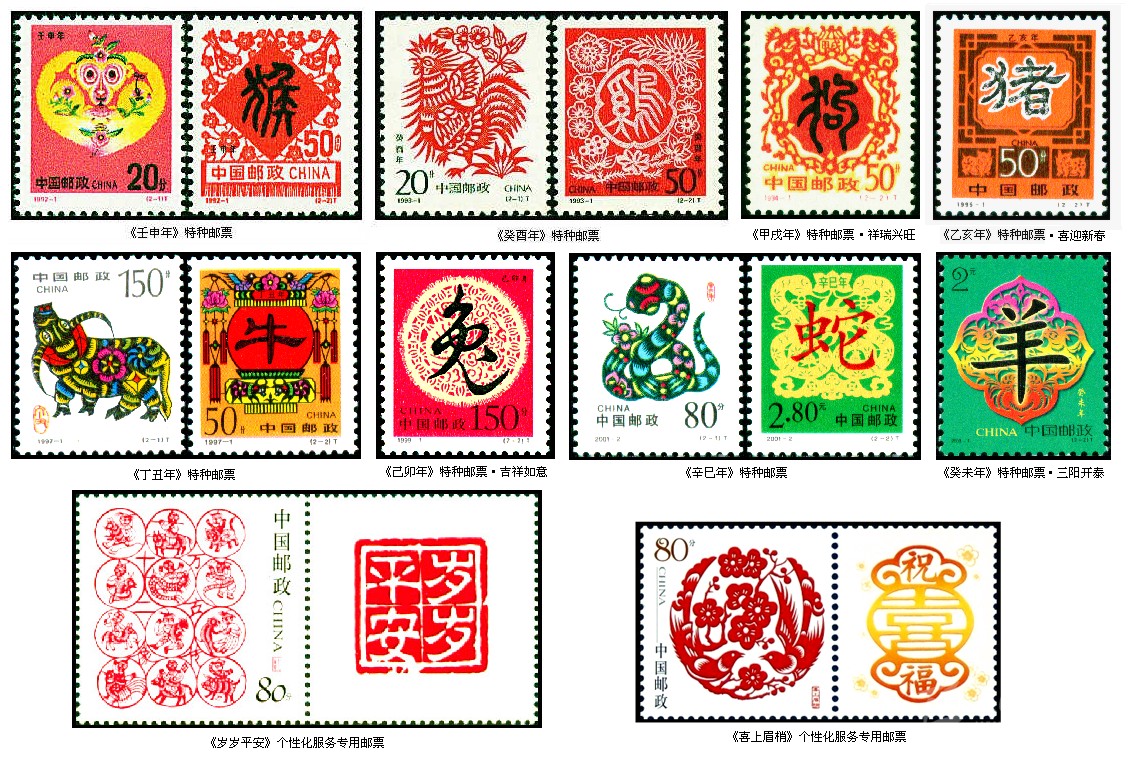 剪紙作為藝術(shù)百花園中的一朵奇葩,在我國郵票圖案設計中應用也非常廣泛。由于傳統的民間剪紙有著(zhù)濃郁的吉祥喜慶氣氛,因此在我國近些年發(fā)行的生肖郵票中多次出現剪紙藝術(shù)。在第二輪12套24枚生肖郵票中的剪紙圖案分別有1992年《壬申年》的“猴桃獻瑞”和“喜鵲登梅”、1993年《癸酉年》的“雄雞報曉”和“四季吉祥”、1994年《甲戌年》的第二枚“祥瑞興旺”、1995年的《乙亥年》的第二枚“喜迎新春”、1997年的《丁丑年》的“金牛奮蹄”和“牛耕年豐”、1999年《己卯年》的第二枚“吉祥如意”、 2001年《辛巳年》的“祥蛇祝?!焙汀跋檫\普照”以及2003年的《癸未年》第二枚“三陽(yáng)開(kāi)泰”等。這些郵票中剪紙圖案有的直接取材于民間,有的則是在原作基礎上再創(chuàng )作。如“雄雞報曉”一枚,圖案選用的是河北省獻縣本齋鄉鄧家莊蔡蘭英老人的剪紙“百雞圖”中的一幅,而“金牛奮蹄”一枚,圖案是根據山東高密民間藝人齊秀花的剪紙“媳婦騎?!痹偌庸?chuàng )作而成的。在我國發(fā)行的祝福系列個(gè)性化服務(wù)專(zhuān)用郵票中也有吉祥喜慶的剪紙圖案,即2005年11月6日的《歲歲平安》和2005年11月11日的《喜上眉梢》等。